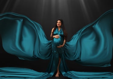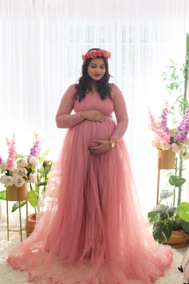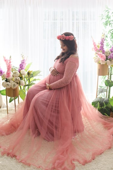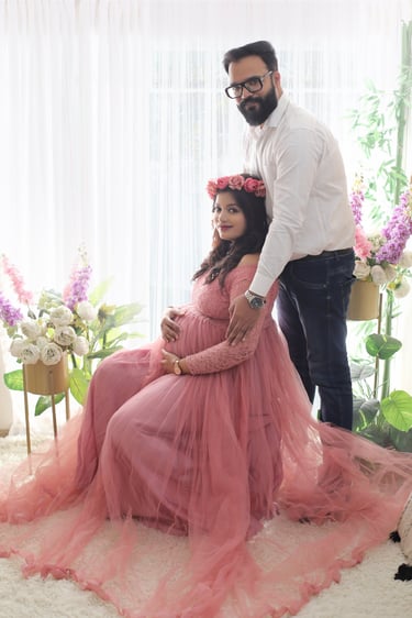 Our studio maternity shoot in Noida offers a controlled and comfortable environment where lighting, themes, and styling come together perfectly. The studio is fully air-conditioned and designed specifically for maternity and baby photography. You’ll have access to a wide collection of premium maternity gowns, floral setups, drapes, props, and backdrops. Professional makeup, hairstyling, and saree draping services are also available on request to ensure you look and feel your best.