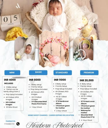 From curled-up sleepy poses to parent-baby bonding moments, each photo is planned to reflect love, warmth, and natural beauty. Our affordable newborn photography packages include edited images, all clicked photos in JPEG format, and the option to add short videos or printed albums.
